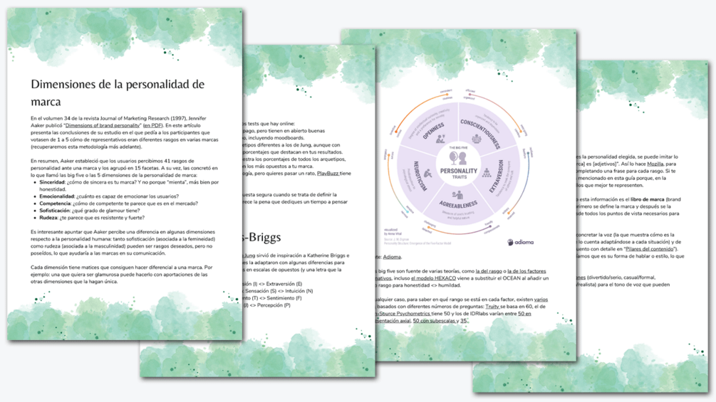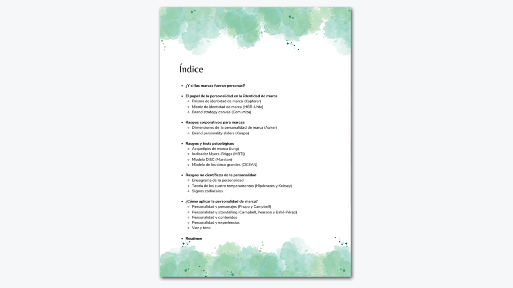 Acabas de leer la introducción de mi guía sobre personalidad de marca. El índice incluye: tres formas de identificar tu identidad de marca, las dimensiones de Aaker, los arquetipos de Jung, el indicador MBTI, el modelo DISC y los cinco grandes, entre otras formas de conocer cómo es tu marca, con enlaces a test y plantillas para que la descubras y también consejos de aplicación a tus contenidos.